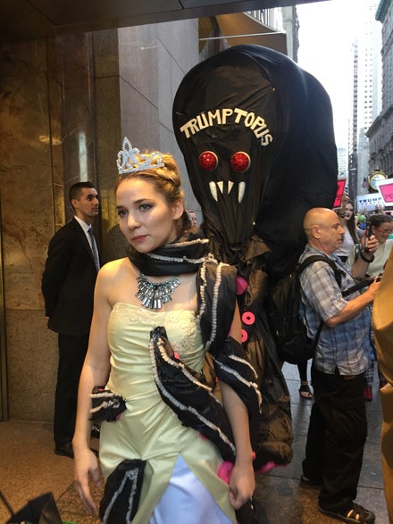 On a narrow stretch of sidewalk outside of Trump Tower, a woman dressed as a vagina was being directed to keep moving by a male police officer. Behind her, a blonde woman in a tiara and formal wear — a beauty queen — was trailed by a giant black octopus labeled “TRUMPTOPUS,” its tentacles coiling around her. A doorman in a suit stood in the doorway, staring steadfastly ahead.