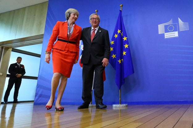 Theresa May is welcomed by European Commission president Jean-Claude Juncker at the EC headquarters in Brussels. Yves Herman / Reuters