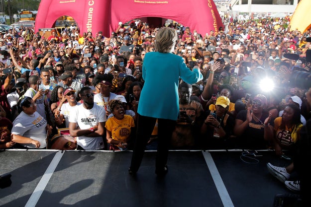 Hillary Clinton speaks to people at the Bethune-Cookman University homecoming football game in Daytona Beach, Florida on Saturday. Brian Snyder / Reuters