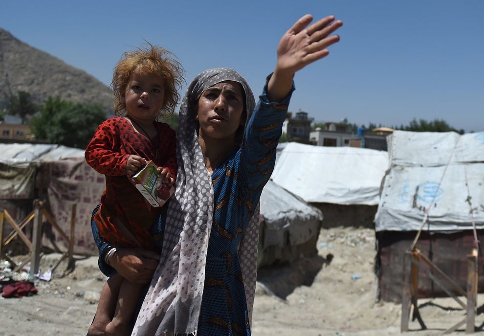 An internally displaced Afghan woman holds a child at a refugee camp in Kabul Wakil Kohsar / AFP / Getty Images